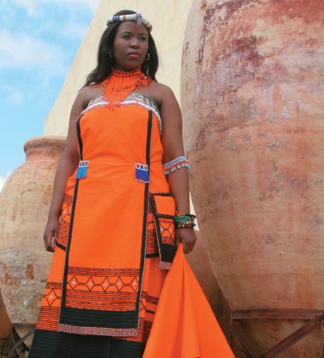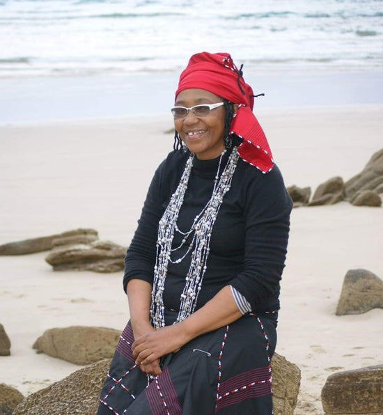 Sis’ Vee (pictured) and Sis’ Qoko have been designing clothing for over 40 years. They’ve worked with customers from across South Africa, and abroad, including well known South African personalities. In the last 20 years their attention and passion have been directed towards traditional clothing and rural development. They are actively involved in the business, oversee product design, development and training, and work closely with customers to create unique custom-made pieces. [Sis’ Qoko refuses to have any photos taken of her. We are still working on it…]