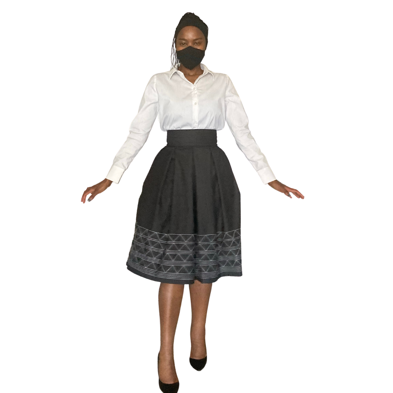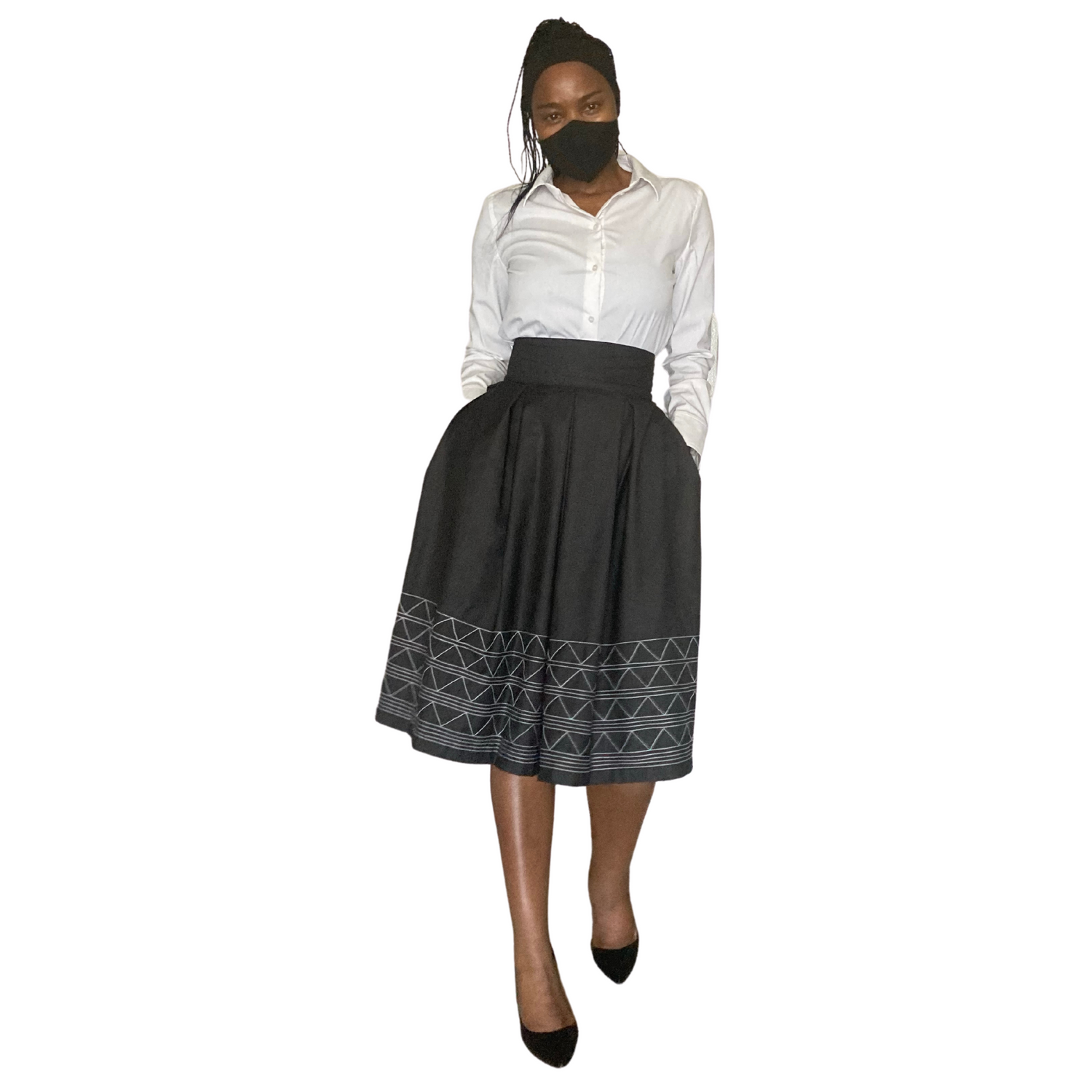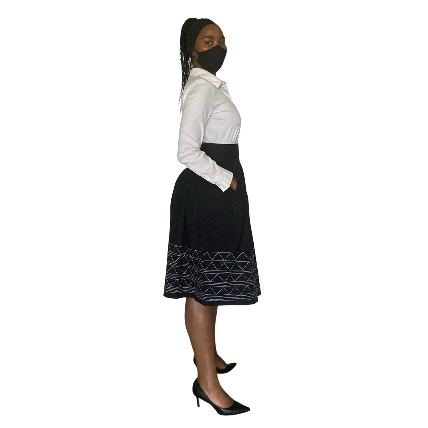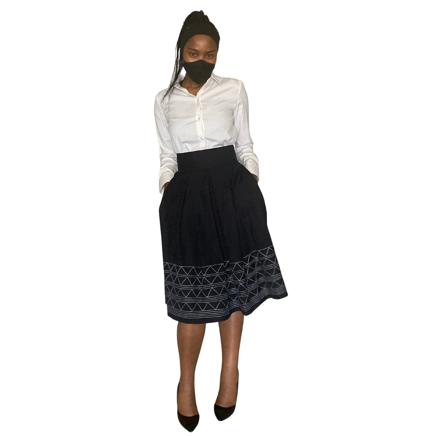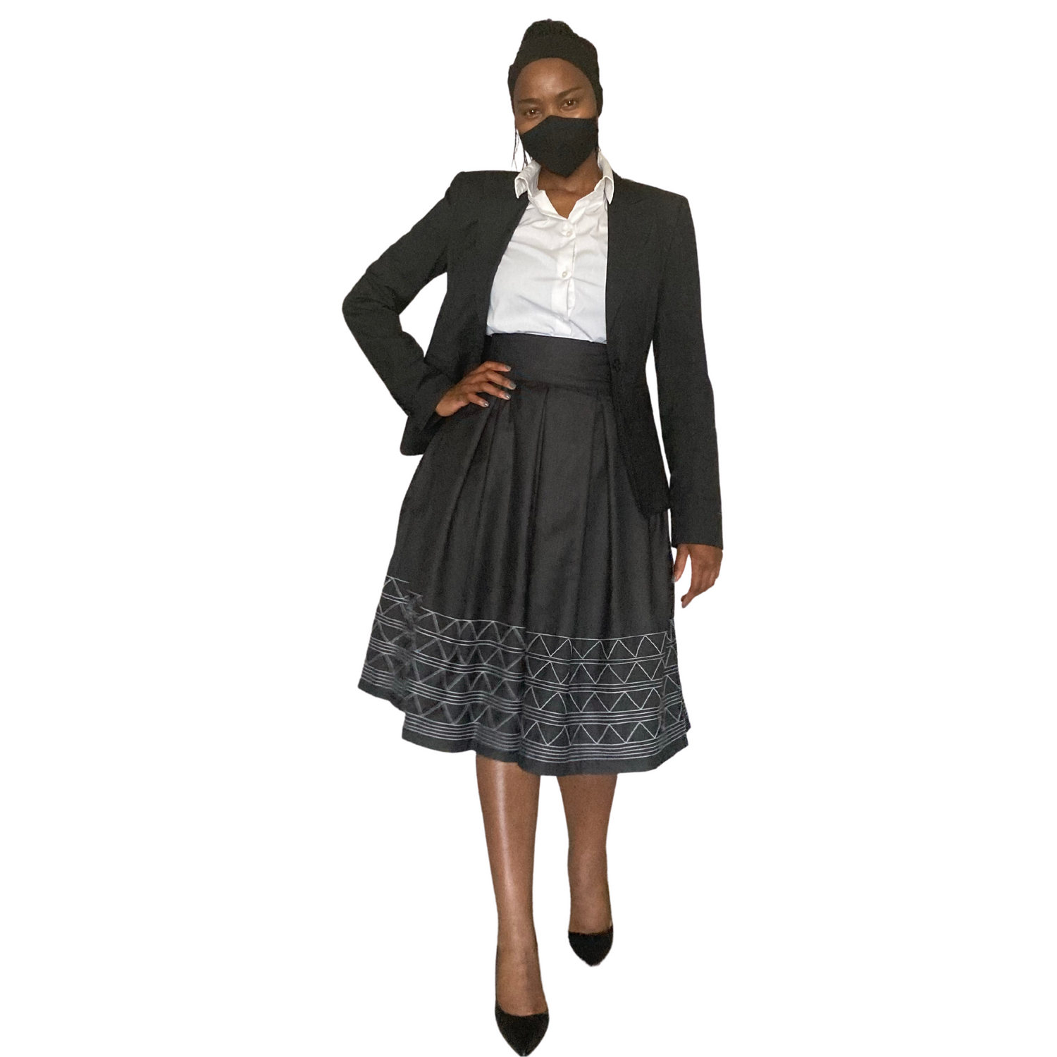 This skirt is made with suiting material which combines the best of both natural and man-made materials for a great body and movement pattern. The detail is machine-stitched by our seamstresses and junior designers.