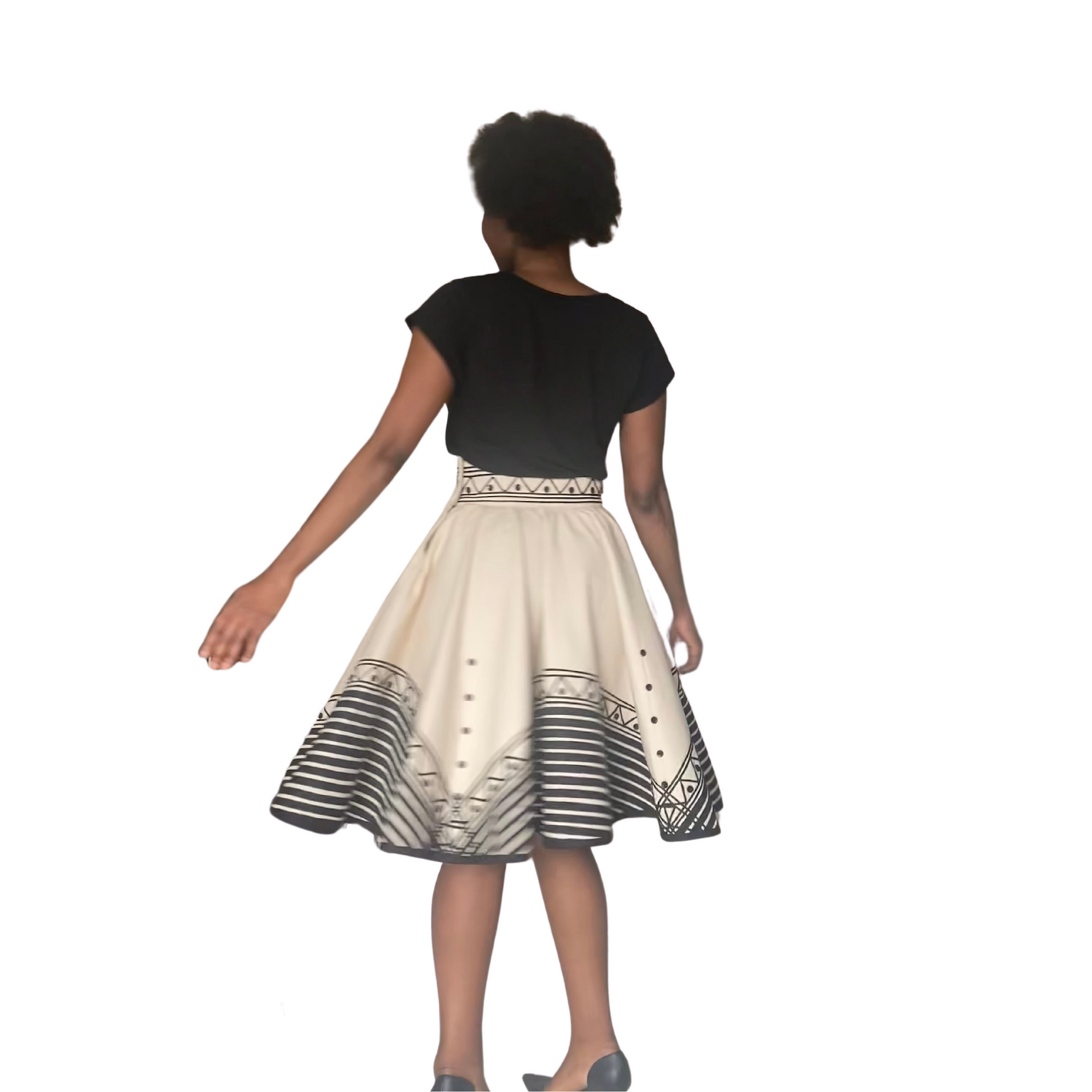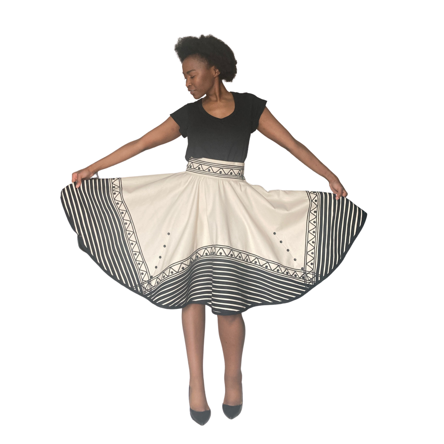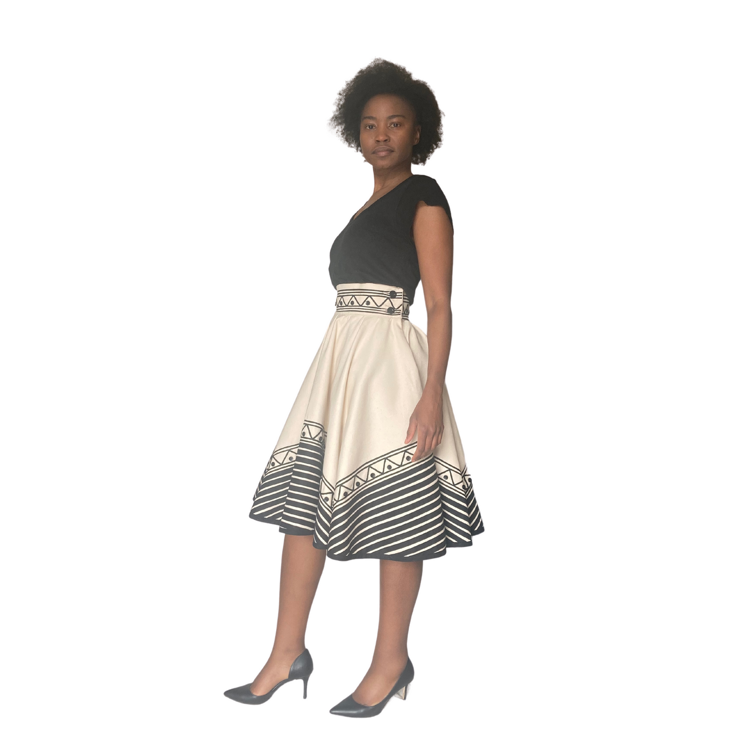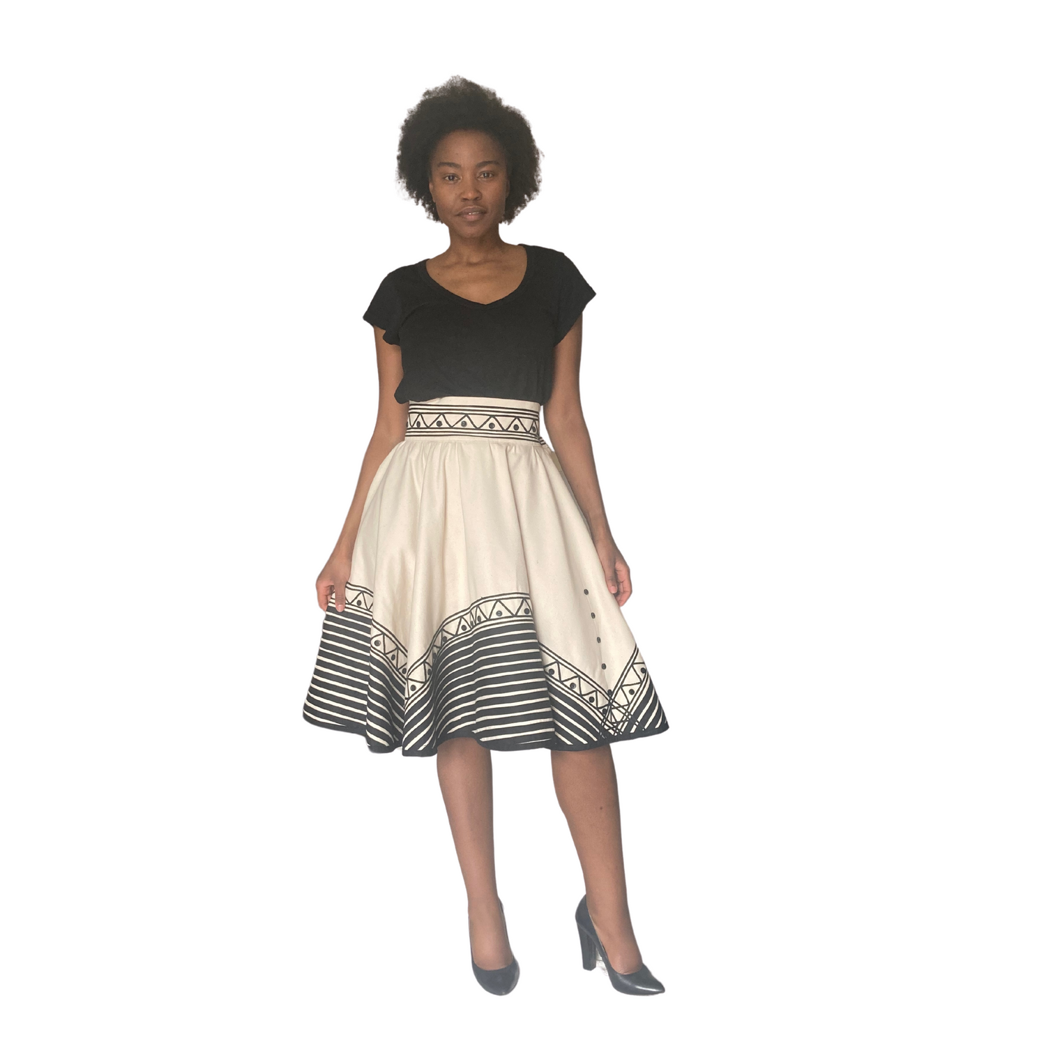 This skirt sits just below the knee. It is made with umbhaco fabric. Get in touch if you'd like to have yours made in linen.